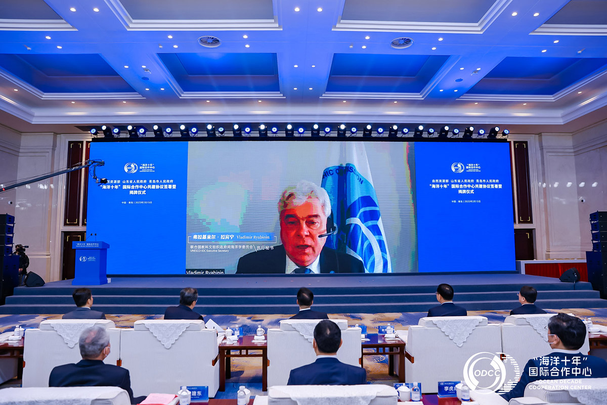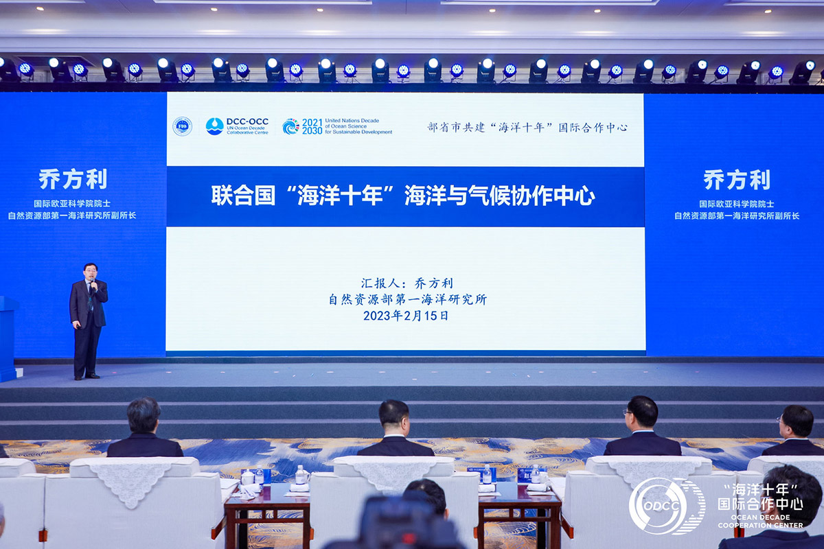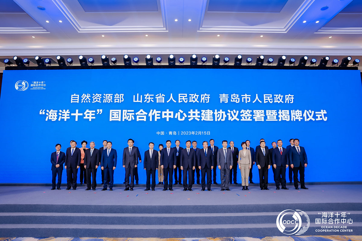 On the morning of 15th February 2023, the domestic launching ceremony of the United Nations Decade of Ocean Science for Sustainable Development (2021-2030) (hereinafter referred to as the Ocean Decade) Decade Collaborative Centre on Ocean-Climate Nexus and Coordination Amongst Decade Implementing Partners in P. R. China (DCC-OCC) was held in Qingdao, together with the signing of the agreement on promoting the implementation of the Ocean Decade and supporting the operation of DCC-OCC by the Ministry of Natural Resources, the People's Government of Shandong Province and the Qingdao Municipal People's Government. Mr. WANG Hong, Vice Minister of the Ministry of Natural Resources (MNR) and Administrator of the State Oceanic Administration, Mr. FAN Bo, Vice Governor of Shandong Province, and Mr. ZHAO Haozhi, Deputy Secretary of Qingdao Municipal Committee of the CPC, and Mayor of the Qingdao attended the ceremony and delivered speeches. Mr. Vladimir Rabinin, Executive Secretary of the Intergovernmental Oceanographic Commission of UNESCO, addressed the ceremony by video. Dr. Qiao Fangli, Decade Advisory Board member of UN Ocean Decade, Deputy Director of the First Institute of Oceanography (FIO) of the MNR, and Director of DCC-OCC, gave a report on the progress and blueprint of the DCC-OCC.