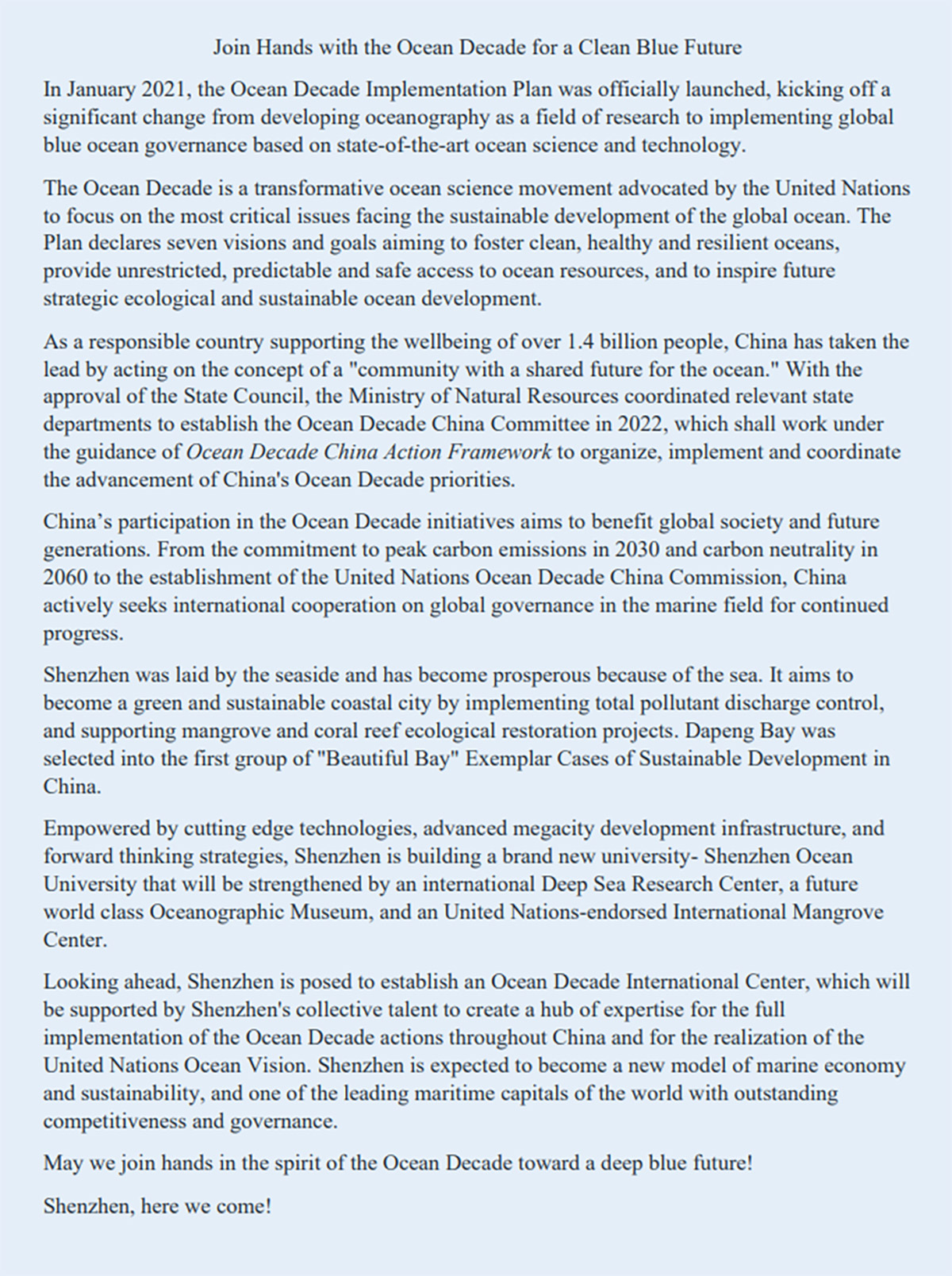 For the original article, please see the link:携手海洋十年,共谱蓝色未来!响应《“海洋十年”中国行动框架(草案)》的深圳倡议暨国际合作高端论坛举行
