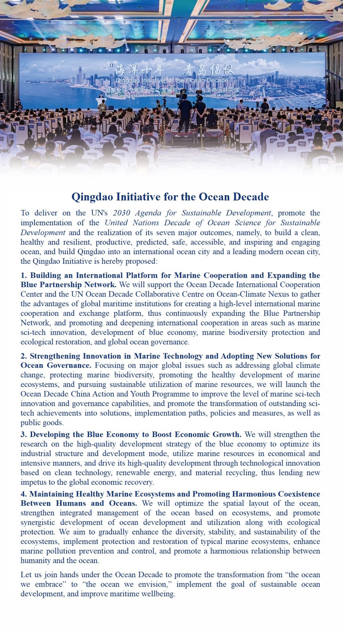 6月28日,以“‘海洋十年’ 和合共生”为主题的2023东亚海洋合作平台青岛论坛在青岛西海岸新区开幕。会上,自然资源部国际合作司司长陈丹红发布“海洋十年”青岛倡议。此次倡议的发布,将进一步推动联合国“2030年可持续发展议程”目标落实,促进“海洋十年”七大愿景实现,有助于凝聚全球“海洋十年”发展共识和推动构建海洋命运共同体,助力青岛打造国际海洋名城和建设引领型现代海洋城市。