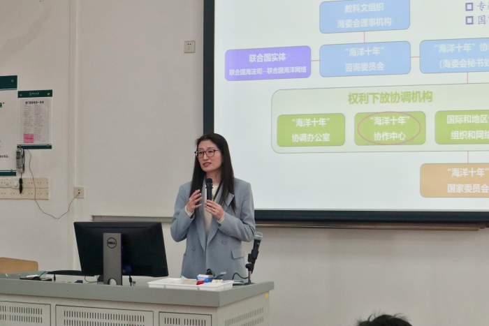 管松博士首先介绍了“海洋十年”全球倡议及其对全球海洋治理和海洋法的影响,以及发起“海洋十年”进校园活动的意义。她指出,海洋问题不仅是自然科学问题,更与国际海洋法、全球海洋治理密切相关,中国从倡议筹备阶段即深度参与“海洋十年”相关工作,积极推动海洋公共产品供给,提升发展中国家应对气候变化能力,展现了负责任大国的担当。